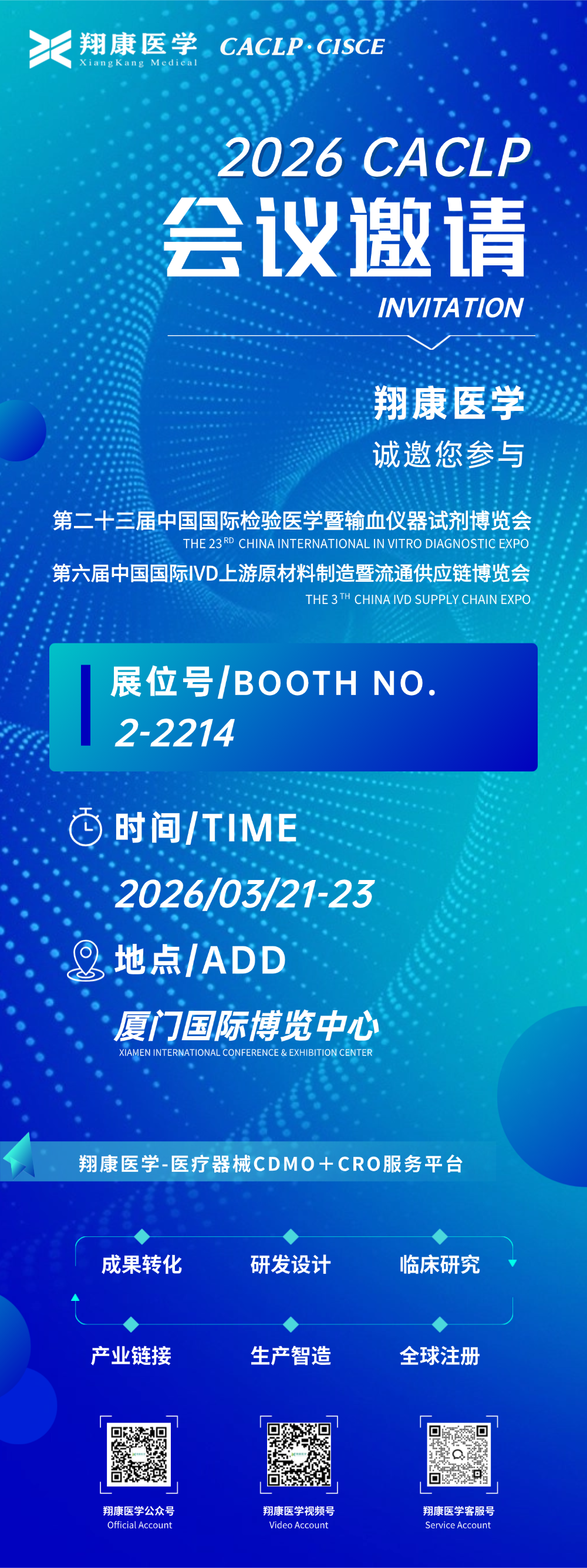 届时,翔康医学将携医疗器械CRO+CDMO一站式解决方案,亮相2-2214展位。期待与您共同探讨行业前沿动态,深入剖析市场趋势,共话发展!