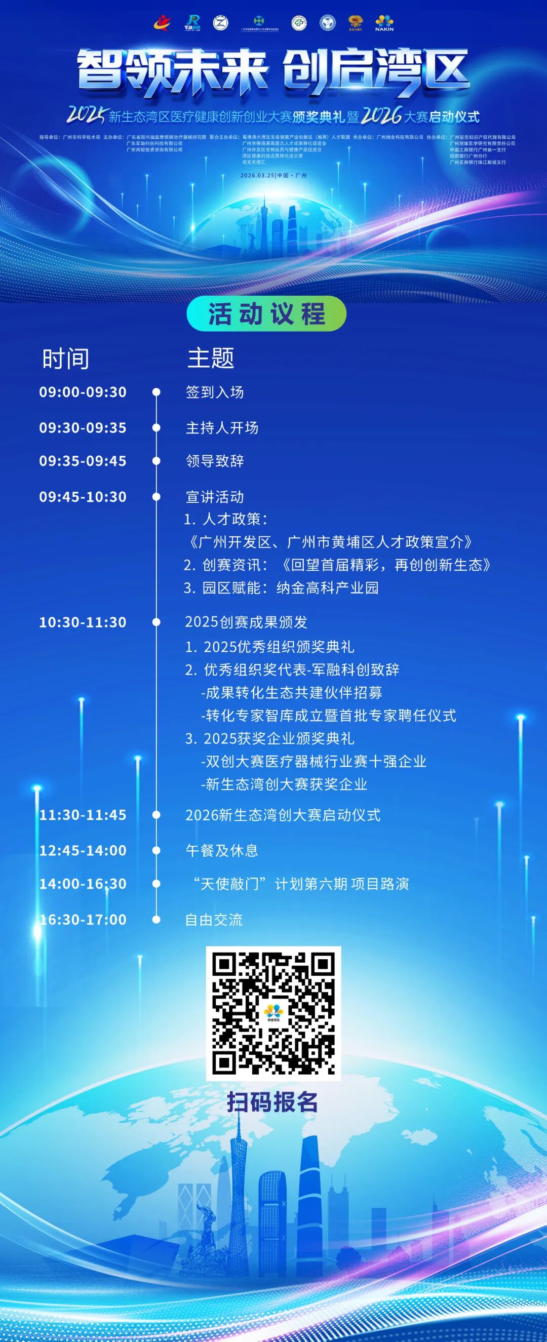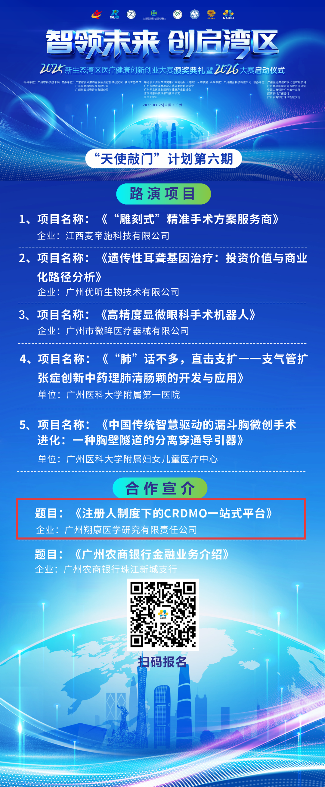 【3月25日广州】2025新生态湾区医疗健康创新创业大赛颁奖典礼暨2026大赛启动仪式发表时间:2026-03-24 16:17 ![]() 新生态湾区医疗健康创新创业大赛由广东省科学技术协会等单位指导,广东省新兴脑血管疾病治疗器械研究院牵头联合多家机构共同发起。赛事紧扣粤港澳大湾区医疗健康产业高质量发展需求,创新构建 “项目展示 + 资本对接 + 人才交流” 三位一体服务体系,旨在加速前沿科技成果转化,培育医疗健康领域新质生产力,为湾区医疗健康产业创新发展注入持续动能。 翔康医学受邀出席本次大赛,在现场设立专属展位,并将在项目路演环节,发表题为《注册人制度下的CRDMO一站式平台》的主题分享。详情如下: 大会名称:2025新生态湾区医疗健康创新创业大赛颁奖典礼暨2026大赛启动仪式 活动时间:2026年3月25日 (周三)09:00-17:00 活动地点:纳金科技产业园F1座1楼纳金厅(广州市黄埔区瑞和路39号) 指导单位:广州市科学技术局 主办单位:广东省新兴脑血管疾病治疗器械研究院、广东军融科创科技有限公司、广州尚骏投资咨询有限公司 联合主办单位:粤港澳大湾区生命健康产业创新区(越秀)人才联盟、广州市穗港澳高层次人才成果转化促进会、广州开发区生物医药与健康产业促进会、湾区健康科技成果转化成长营、灵支天使汇 承办单位:广州纳金科技有限公司 协办单位:中国工商银行广州第一支行、招商银行广州分行、广州农商银行珠江新城支行 ![]() ![]() |